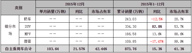 2015年,自主品牌乘用车共销售873.76万辆,同比增长15.3%,占乘用车销售总量的41.3%,比上年同期提高2.9个百分点;其中轿车销售243.03万辆,同比下降12.5%,占轿车销售总量的20.7%,比上年同期下降1.7个百分点;SUV销售334.30万辆,同比增长82.8%,占SUV销售总量的53.7%,比上年同期提高8.9个百分点;MPV销售186.58万辆,同比增长13.6%,占MPV销售总量的88.6%,比上年同期提高2.7个百分点。