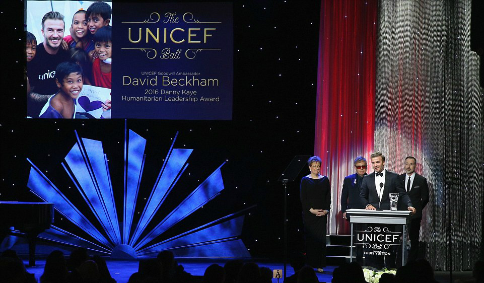 1月12日晚,第六届Biennial UNICEF Ball(两年一届的联合国儿童基金会慈善舞会)于比弗利山庄盛大举行,大卫·贝克汉姆应邀出席,俨然成为全场焦点。比弗利威尔希尔四季酒店红毯上众星云集,星光熠熠,赛琳娜·戈麦斯、玛丽亚·凯莉、妮可·基德曼及海蒂·克鲁姆齐齐聚首,为联合国儿童基金会的生存项目筹集250万美元的善款。
