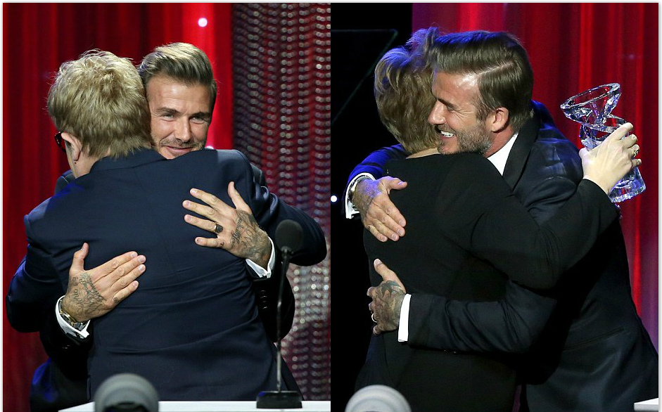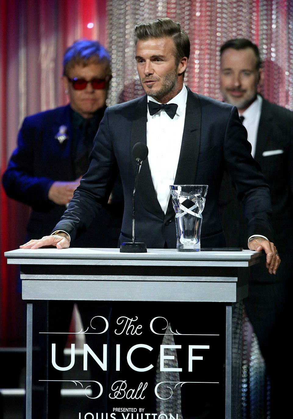 尽管舞会不乏俊男美女,但身着黑色礼服、打着蝶形领结的小贝帅气登场时,这位40岁的迷人绅士立马吸引了全场的注意力。当晚,小贝挚友艾尔顿·约翰亲手为他颁发了人道主义领导奖(Humanitarian Leadership Award)。近年来,小贝始终致力于通过个人的“7号”基金会(Seven Foundation)为各地儿童提供帮助,亲力亲为值得大家的肯定。