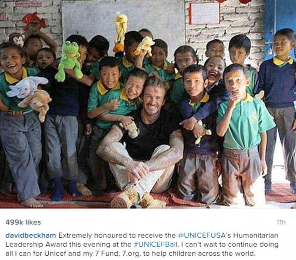 小贝获颁人道主义领导奖前,就已决定在全球七大洲举行七场慈善足球赛,让更多人了解联合国儿童基金会。小贝一直活跃在慈善事业第一线,他担任联合国儿童基金会亲善大使已有10年之久,并创立了个人的“7号”基金会,这次他更是准备组织七大洲慈善足球赛(南极洲也是其中之一),为联合国儿童基金会筹集善款。7号,对于小贝来说意义重大。7不仅是他效力英格兰及曼彻斯特队时的球衣号,更是小女儿哈珀的中间名。现在,这个重要的数字又将再添上一层非凡意义。