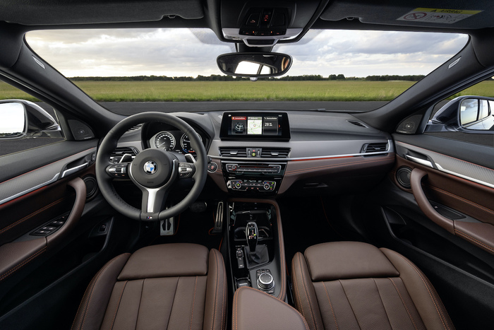 9. 标配双色内饰,带有一体式头枕的M运动型座椅和后排座椅均采用了Dakota皮革,并以醒目的摩卡和无烟煤灰色Alcantara麂皮进行混搭。橙色缝线为内饰增添点睛之笔。