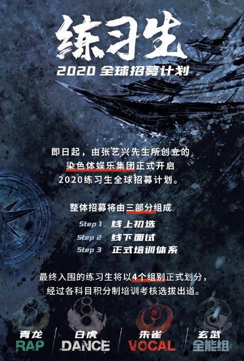 29岁生日当天,张艺兴正式启动了“2020练习生全球招募计划”,招收13~18岁的练习生进行培训考核后出道。
