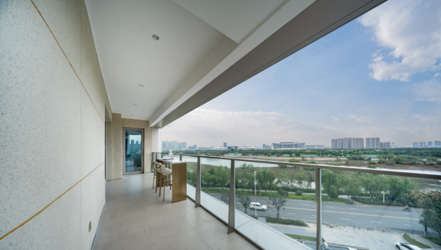 建筑的可能,就是对自然和人文规律的尊重,掩映在水域氤氲之中的建筑,不仅提供完善的生活配套,更能安抚现代都市人的浮躁与不安。自然界河山,隔窗而望,灞河一脉贯天地,对岸是西安国际丝路会展中心,自然景观与人文建筑交相辉映。