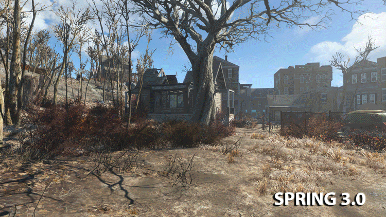 《辐射4》季节Mod其中包含一系列特殊效果,给人一种“大自然中的废土世界”的感觉。春天,绿色遍布废土,明亮的花朵和鲜绿的植物相互映衬,无比好看;夏天,这股绿色会稍微缓和一点,因为新一轮收割庄稼的季节马上就要到了;秋天,废土会长满明亮的观叶植物,原版中干枯的树木会变得更加“丰满”和“有生机”;到了冬天,大雪降临废土大地,银装素裹,美不胜收。》加入季节变化后,末世的波士顿也有了一丝《最后的生还者》的感觉,更突显了了这块末世之地的壮美景色。