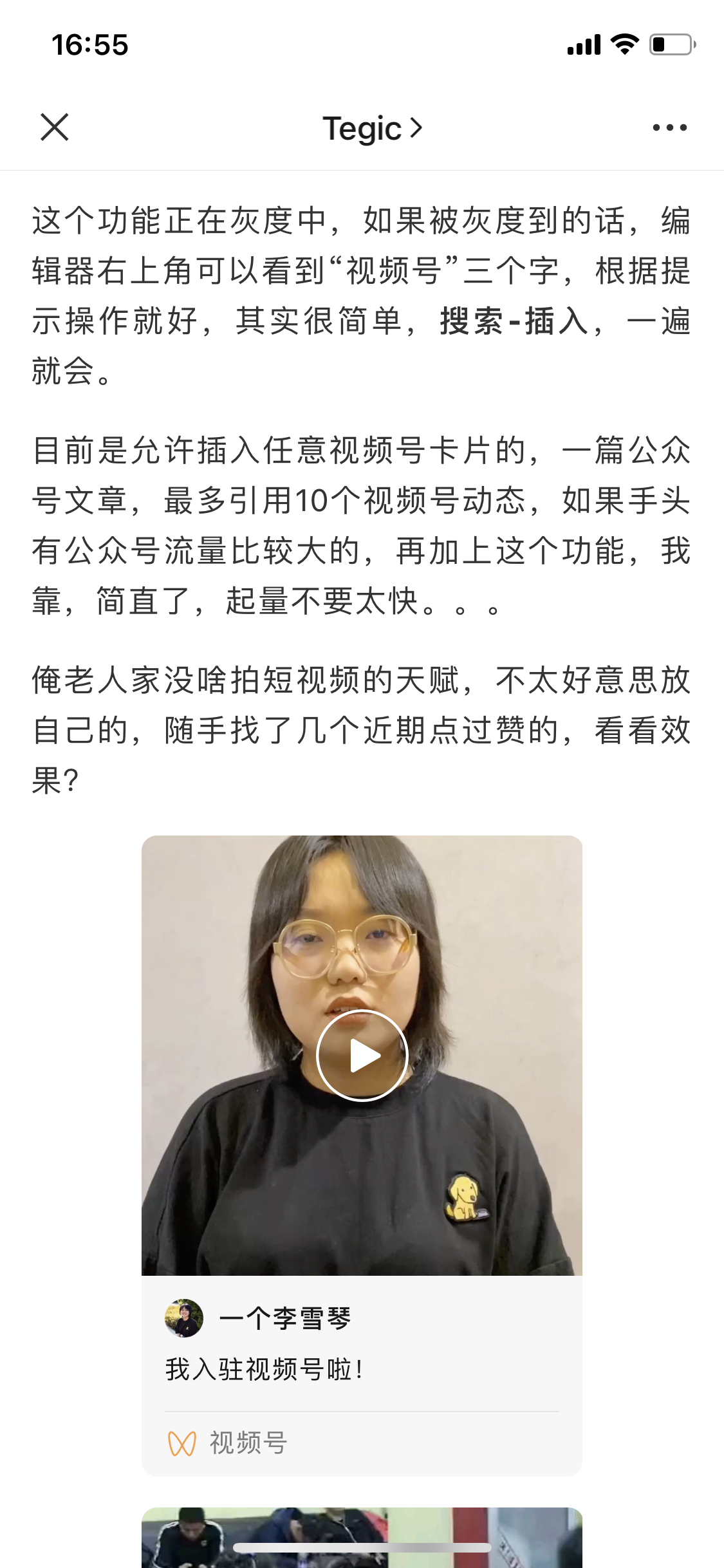 界面新闻从微信方面了解到,目前,公众号文章内已支持插入视频号动态卡片,点击后可跳转到视频号动态的详情页。