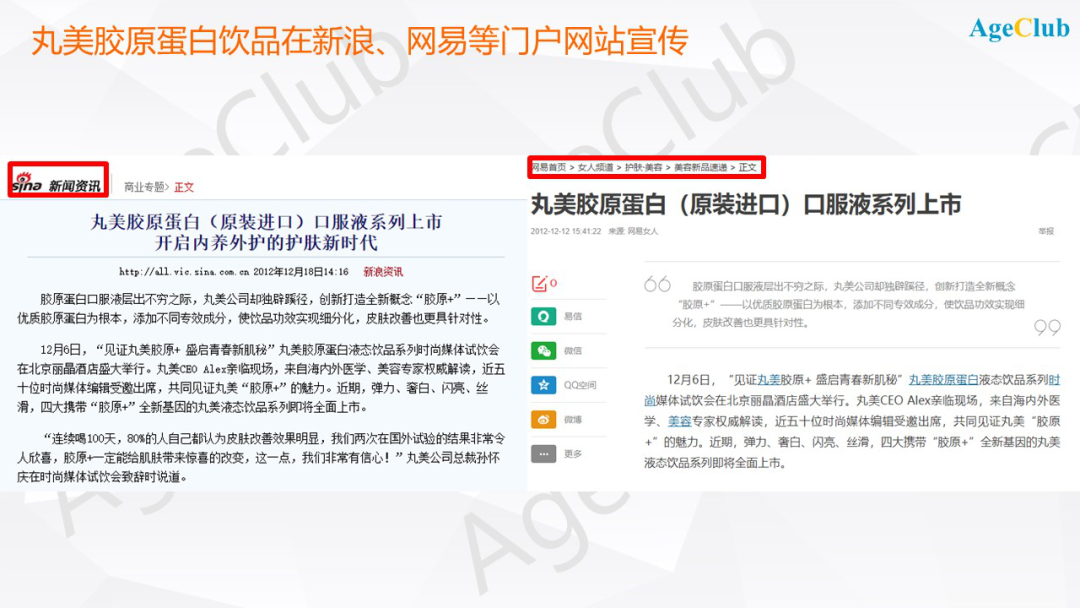 以丸美胶原蛋白液态饮品的营销为例,彼时门户网站依然是大多数国人获取信息的重要渠道。丸美胶原蛋白口服液在上市后,新浪、网易等多家门户网站的美容频道发布了大量宣传胶原蛋白功效的文章。标题突出护肤概念,比如新浪时尚的刊文《丸美胶原蛋白口服液 开启内养外护的护肤新时代》。