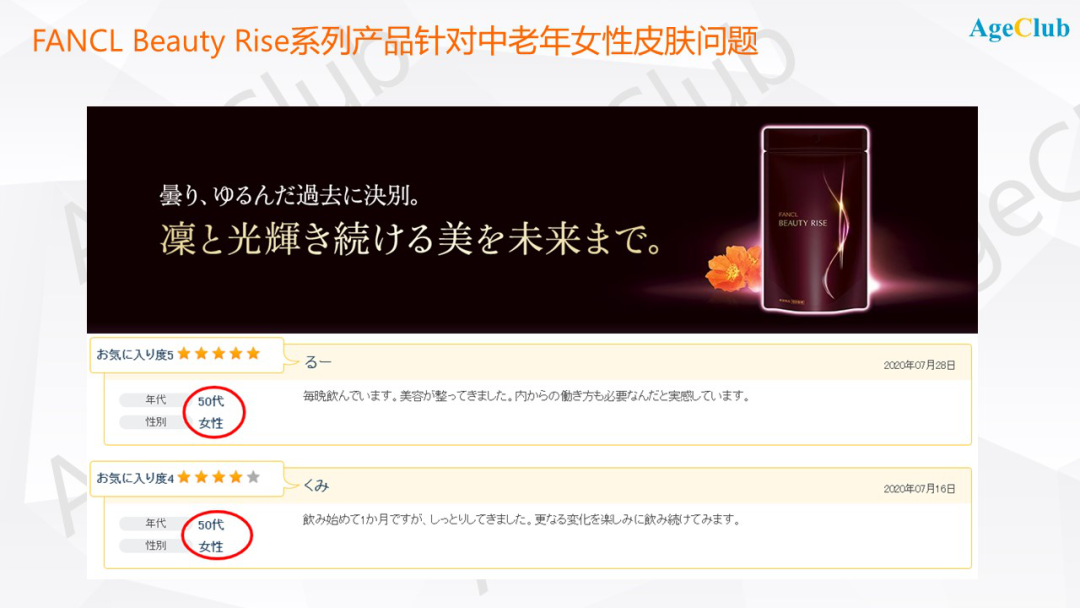 日本最大护肤及健康食品品牌 FANCL旗下的Beauty Rise 抗糖丸/口服液就是其中最具代表性的产品,宣传标语就是“追求美丽,无惧年龄”,其官网的评论显示购买者多为50岁以上的女性。