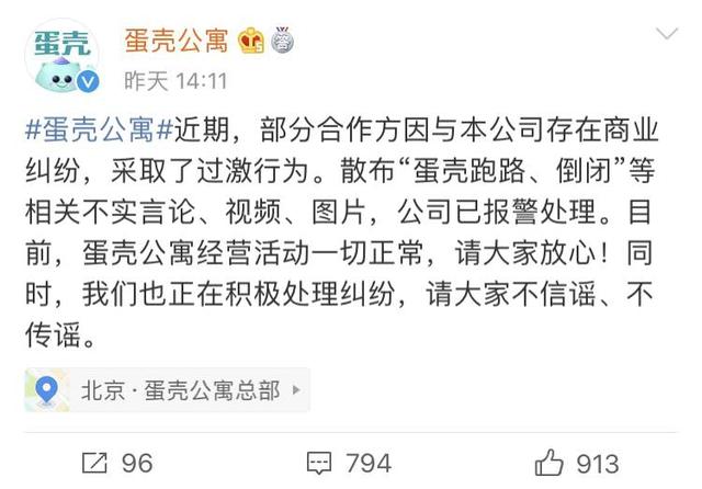 针对这一消息,蛋壳公寓官方微博做出回应:表示不要轻信谣言,对于散播谣言者已做报警处理,并对外表示公司的运行一切正常。