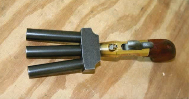 鸭掌手枪因其枪管形似鸭掌而得名。这种手枪诞生于1700年代到1800年代之间,少则三个枪管,多则六个。通常,每支枪管都瞄准不同的方向,有一种变异型鸭掌手枪有两个枪管指向前方,第三支枪管则向上。还有一种拥有四支枪管,竟然两两指向两侧。