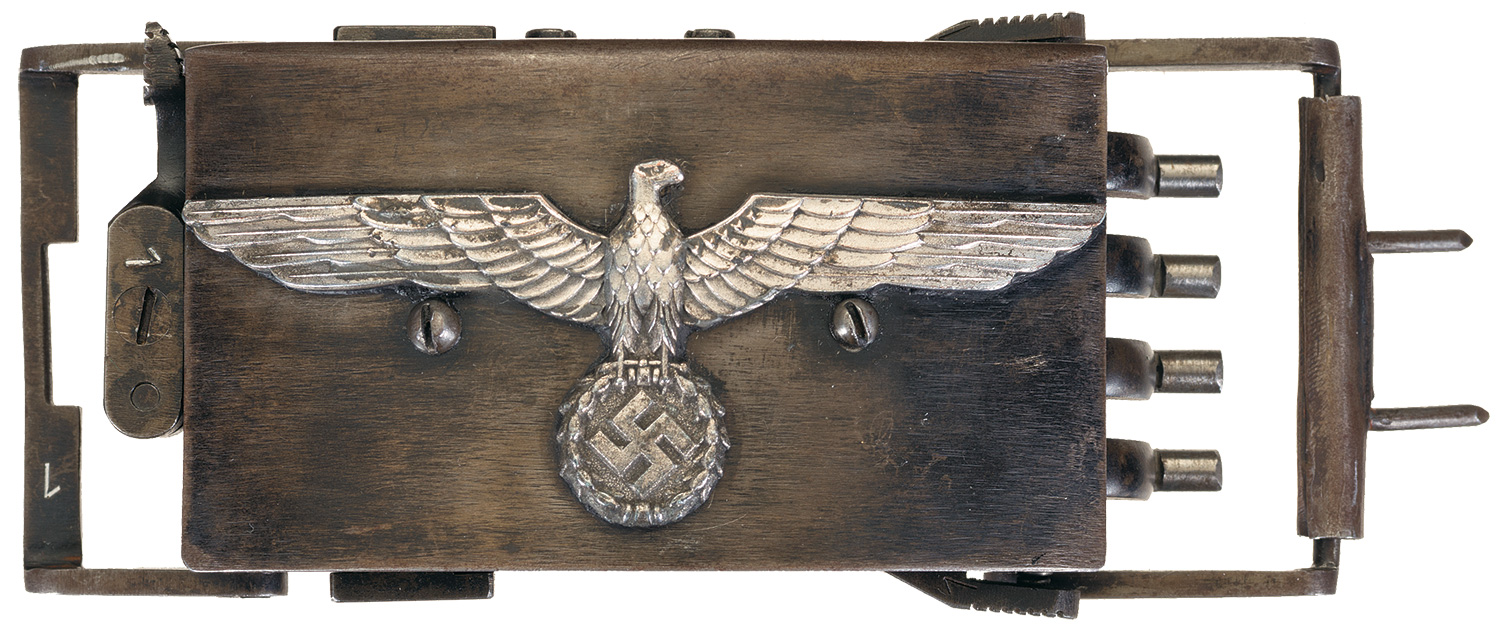 这种枪乍看是皮带,其实里面暗藏一把手枪。纳粹皮带扣手枪的发明者是路易·马奎斯(Louis Marquis),专为二战时期的德国纳粹党卫军高官制造,以备不时之需。使用时,只需朝上打开皮带扣,枪管就会暴露出来,然后扣下扳机即可。