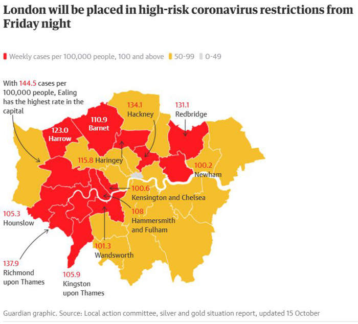 为避免进入全国封城,英国政府于本周公布三级封锁系统,疫情最严重的地区将采取第三级措施。