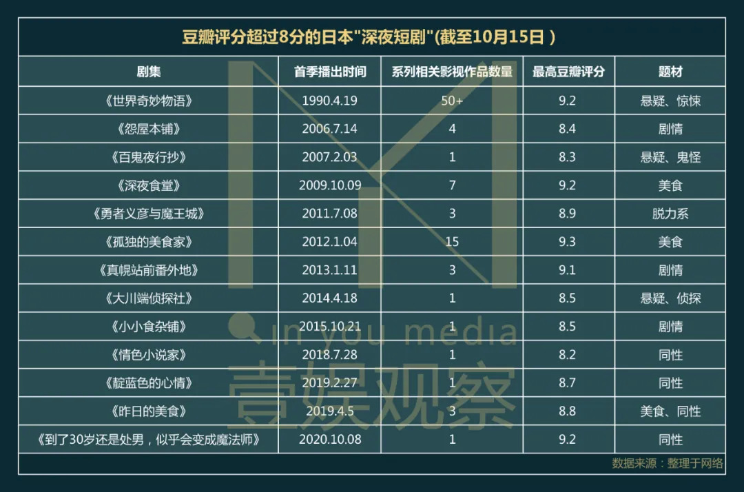 拿日本深夜剧里的“双短”剧为例,壹娱观察(ID:yiyuguancha)整理了口碑超过8分、时长在30分钟以下的主要日本深夜短剧。据不完全统计,超过9分评价的系列剧集有《世界奇妙物语》《深夜食堂》《孤独的美食家》《真幌站前番外地》《到了30岁还是处男》等,扩展至8.8分还有《昨日的美食》《勇者义彦与魔王城》等作品,时间跨度从上世纪90年代到现在2020年,题材也几乎涵盖所有成人向题材。