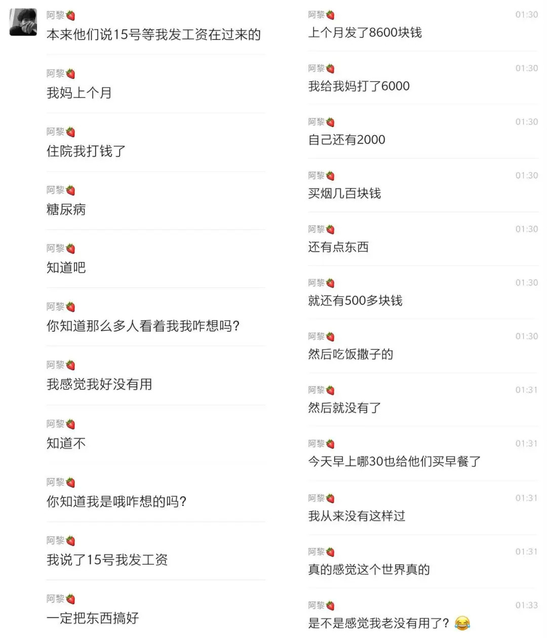 因为“工资未发”“朋友欠下的欠款一直拖欠”,他的饮食起居成了问题,于是我作为手上尚有余钱的人,就近乎理所当然地承担起了借他钱款替他点外卖的“责任”。