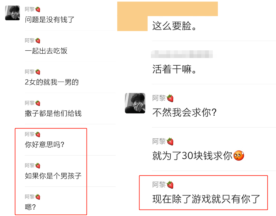 他开始说我“打游戏其实就那样”,问我“除了钱,你还为我付出什么了?我给了你我的真心,你又给了我什么?”,他急于要求我证明我对他“爱”的回应,而这个唯一的回应,就是花在他身上的一笔又一笔金钱。