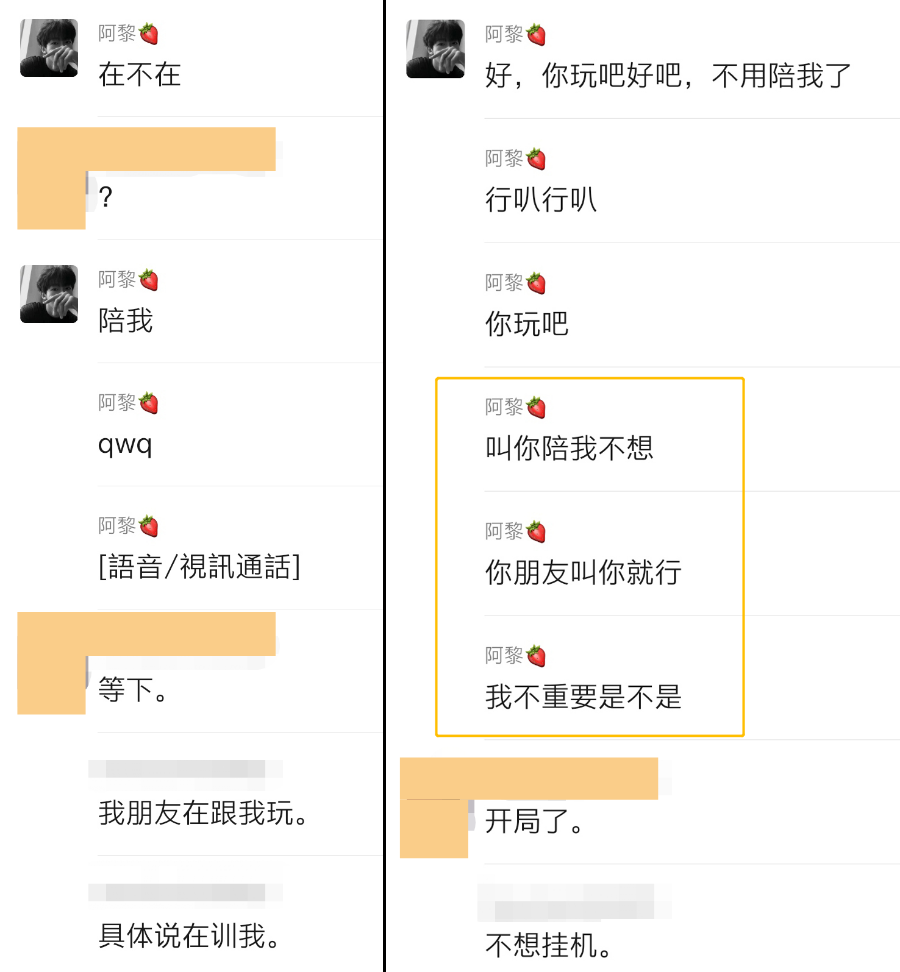 我不知所措,我分不清自己是很难接受这种态度的落差还是舍不得他,但我还是在慌乱之下发送了一大段文字,解释我为什么和别人打游戏,我并不是在有意“伤害”他。