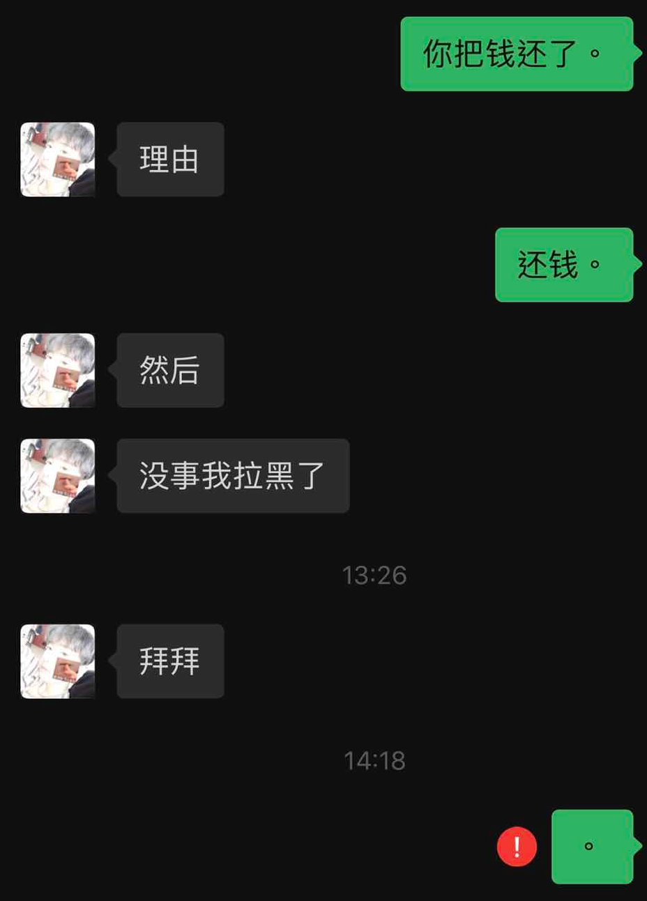当晚,他把这笔钱连同上一次的欠款一并还给我,颇有些骄傲:你看,我就说过我会还的,我才不是骗子。