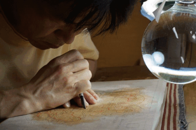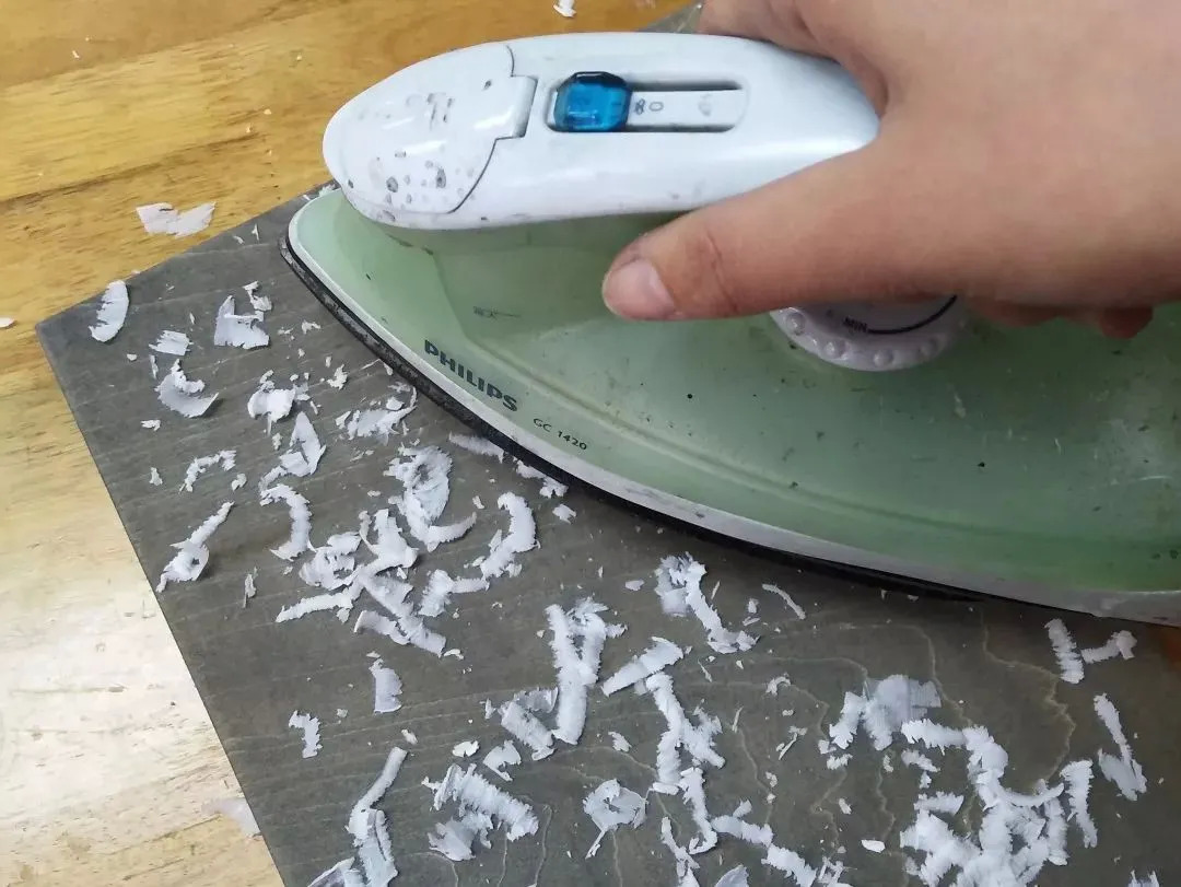 用电熨斗将蜡烫进去,上蜡不仅是为了填满木版中的空隙,上完蜡的变脆,更容易刻制,对刻刀也起到一定的保护作用。