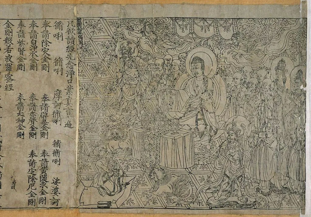 以唐咸通九年所制的版画《金刚经》扉页为例,当时的刻工已是相当地精致。