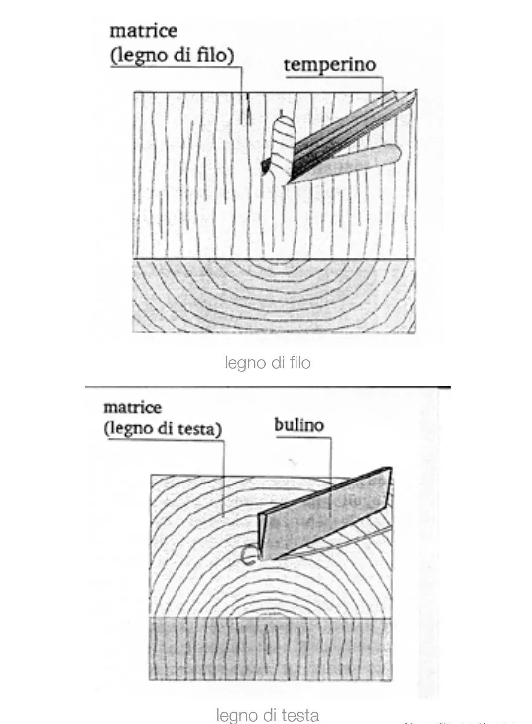相同的技术,在欧洲它的出现和应用就要等到13世纪。在最初的时间里,他们用的都是木纹与版子切割线平行的木板(di filo) , 直到18世纪末才进而出现了切割线与木纹不平行的木板(di testa)。