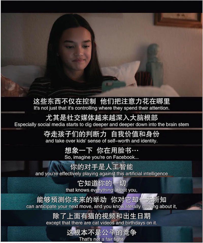 然而,日益引起公众关注的,人们对于社交媒体的上瘾式依赖,却同此种个性化定制的内容投放手段息息相关,正如片中受访者杰夫·希伯特所言:“互联网公司获取用户持续的注意力所利用的是根植于人类本性中的东西。”脸书前主席西恩·帕克也认为:“社交媒体是在利用人类心理中的脆弱挣钱,注意力经济直接影响着奖赏通路中的多巴胺释放,而当算法能够做到超越人类生物属性所具有的弱点时,上瘾便由此产生。”斯坦福大学医学院的安娜·兰博克博士指出:“算法、社交媒体与监视资本主义,为了使其用户对社交媒体保持长久的使用与关注,不断利用着每个互联网使用者共有的、基本生物学因素。”