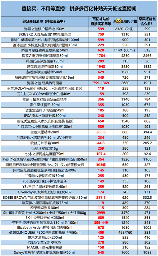 在一份的拼多多大牌美妆专区产品价格列表中,将拼多多的价格与某直播间进行比较,可以发现拼多多的价格优惠力度可以达到50%,甚至60%多。