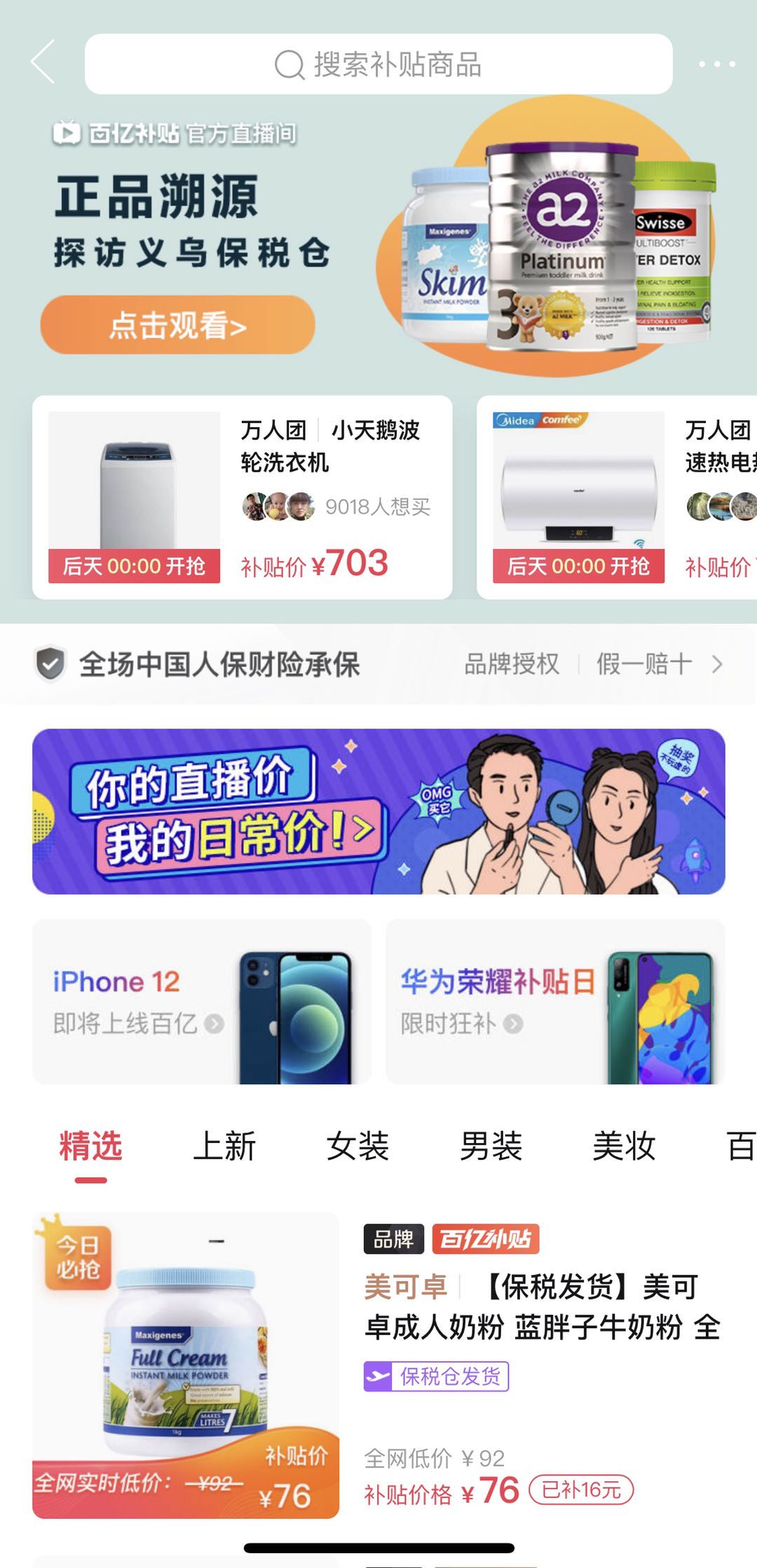 在购买专区的上方有一行字,“品牌授权,假一赔十”,“全场由中国人保财险承保”。点进去后可以看到,拼多多列举了多个一线大牌的logo,表明自己和在售大牌都有深入合作,而百亿补贴是成本价基础上再减去官方补贴。同时,还大大地贴出了“拼多多x品质保障”的字样。
