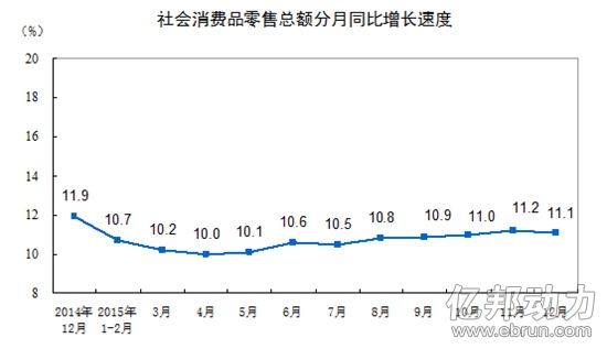 据亿邦动力网了解,2015年12月份,社会消费品零售总额28635亿元,同比名义增长11.1%(扣除价格因素实际增长10.7%,以下除特殊说明外均为名义增长)。其中,限额以上单位消费品零售额15367亿元,增长8.6%。