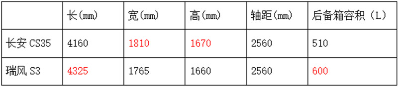 轴距相当,两者的空间利用率都比较好,乘坐空间较为宽敞,满足日常用车需求;储物空间方面,瑞风S3的后备箱容积相对于CS35更具优势,储物能力更甚。
