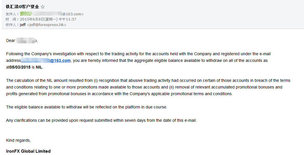 6月,约400多个投资者账户被禁止出金。汇商一位读者发来邮件称收到铁汇通知,要将他的账户资金“清零”,并通知他,“如果不想账户清零,必须与铁汇签署协议,资源放弃此前的存款资金。”