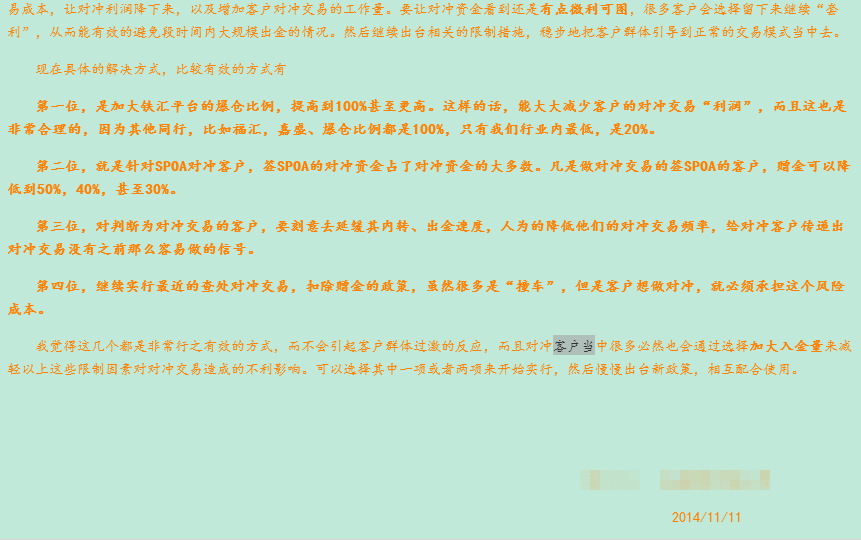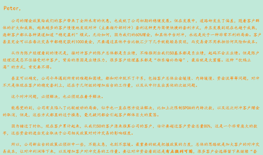9月初,汇商收到一位铁汇中国区前员工来信,称在2014年铁汇尚未全面爆发危机之前,内部已经开始意识到“赠金套利”的严重性。这位员工曾向当时的铁汇中国区负责人Peter Han“上书”,阐述了当时业务形式及运营模式的弊端,并提出诸如“加大铁汇平台的爆仓比例”等应对方案。遗憾的是,事情很快发展到无可挽回的地步,最终导致铁汇在中国市场全面大溃败。