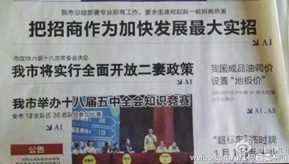 【广东】《阳江日报》辟谣刊登“二妻政策”:系P图恶搞 已报网警处理
