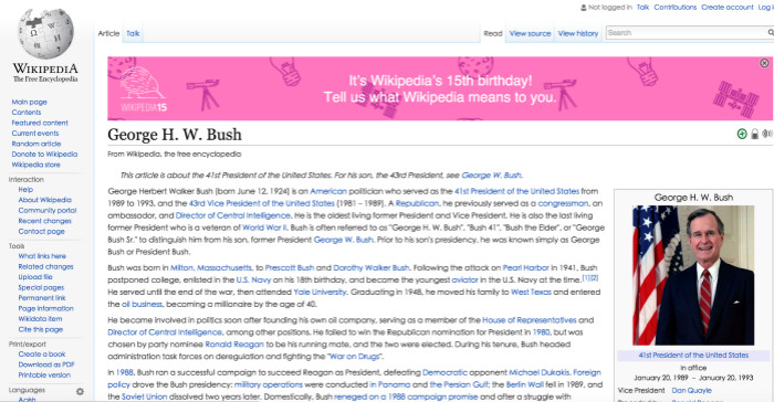 布什的英文页面曾经历超过8亿次的修订,共有45,862次编辑,其中2004年和2005年伊拉克战争更是将他推向“被编辑”的高峰期。2014年,布什的页面同样维基百科冠为“最具争议性的”。