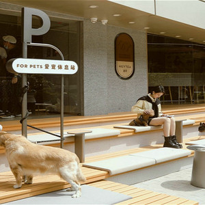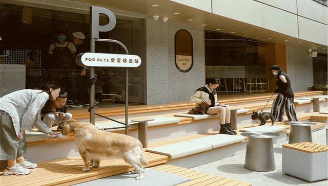 喜茶新开的宠物主题店主要分为三大区域:就餐客区、休闲客区、宠物外摆区,宠物主题店的大门上还有宠物友好专属Logo。