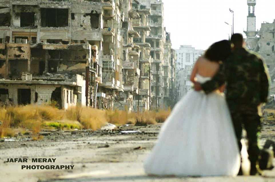 新娘和身为战士的新郎在饱受战火蹂躏的叙利亚城市Homs拍摄了一组难忘的照片。