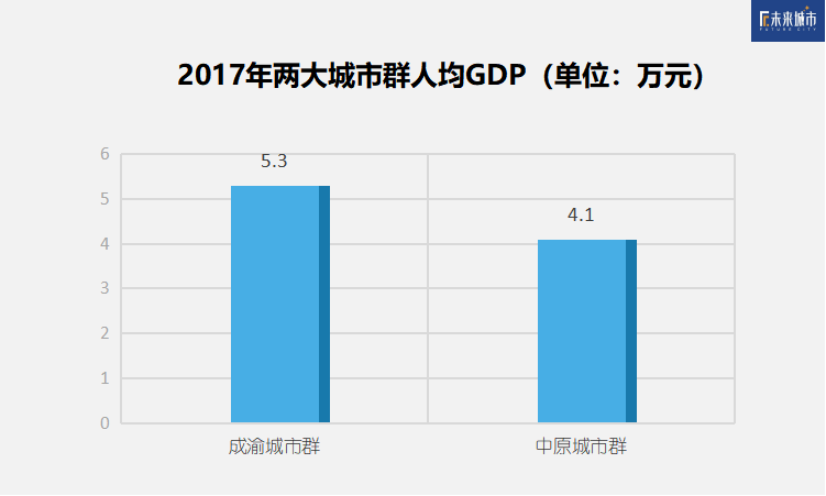 其实,根据上面的两张图,有些答案已经浮出了水面。中原城市群人口是成渝城市群的3倍多,而GDP却没有将这部分差额弥补。数据显示,2017年,成渝城市群人均GDP为5.3万元,中原城市群人均仅为4.1万元。