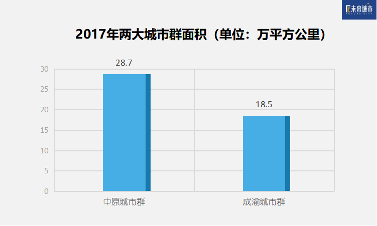 2017年,中原城市群的面积为28.7万平方公里,同期成渝城市群面积为18.5万平方公里。然而,多出来的这部分面积并没有为中原城市群创造更高的经济总量。这和地理位置有关,中原城市群集中于华北平原,这曾经是四大粮仓之一,第一产业的比重长期较高。相比之下,成渝城市群制造业的发展一直很突出。