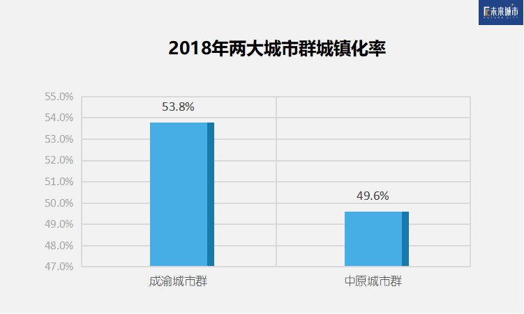 而这也导致了中原城市群的城镇化率不及成渝。数据显示,2018年,中原城市群的城镇化率为49.6%,同期成渝为53.8%。