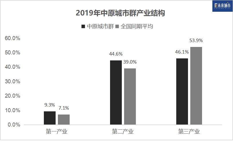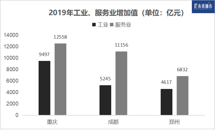 除开农业,中原城市群在工业、服务业上表现得也不尽如人意。成渝城市群的核心重庆、成都不管在第二产业还是第三产业上都远远超过了中原城市群的核心郑州。