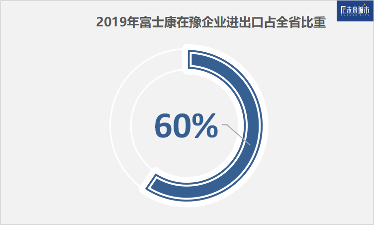 如图所示,2019年,富士康在豫企业进出口3399.4亿元,占全省比重近60%。而2019年郑州的进出口总额也在中部六个省会城市中摘得桂冠,几乎为第二名武汉的两倍。一个企业带动一座城市,富士康所蕴含的力量不可小觑。