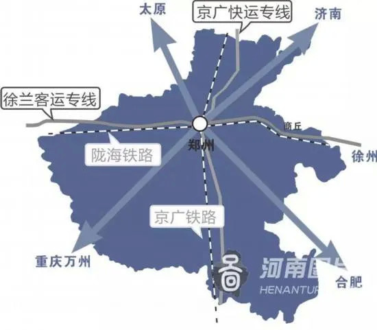 地处中国两大铁路动脉,京广线和陇海线的交汇口,平均每五分钟就有一趟列车经过郑州。并且,按照国家高铁规划,郑州将形成“米字形”高铁格局,从郑州向中国各个方向延伸。“米字形”高铁建成后,郑州到合肥、济南、太原等城市的时间将缩短至2小时以内。
