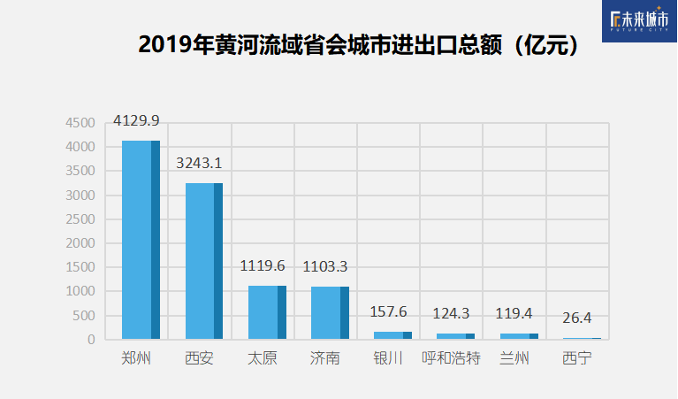 除此之外,通达全国的陆路交通使得郑州成为天然的国际航空货运基地。今年1-7月,郑州机场累计完成货邮吞吐量增速在全国大型机场中排名第一,客货运规模也继续保持着中部双第一的成绩。2019年黄河流域省会城市的进出口总额中,郑州同样遥遥领先,比第二名西安多了将近1000亿元。