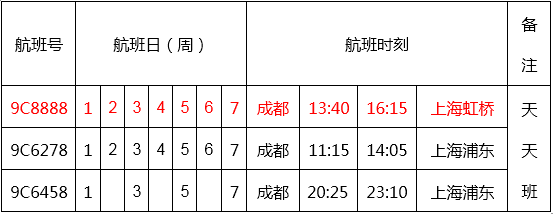 *以下为成都至上海航线详情,仅供参考。具体时刻信息以航空公司官网公布为准。