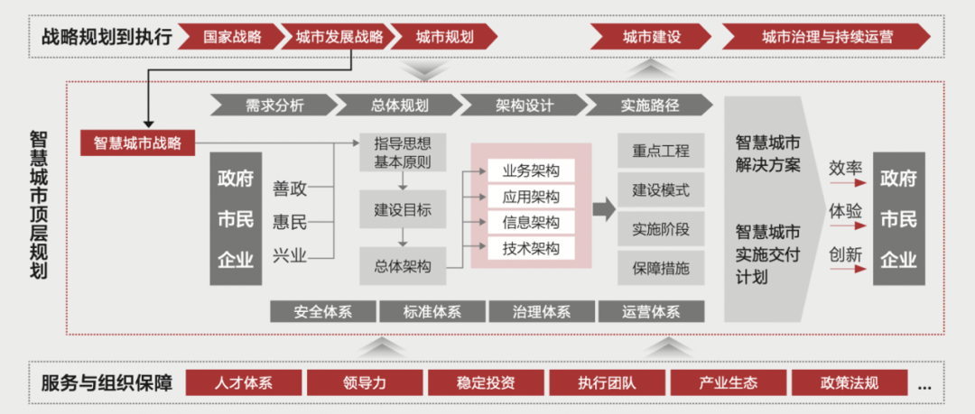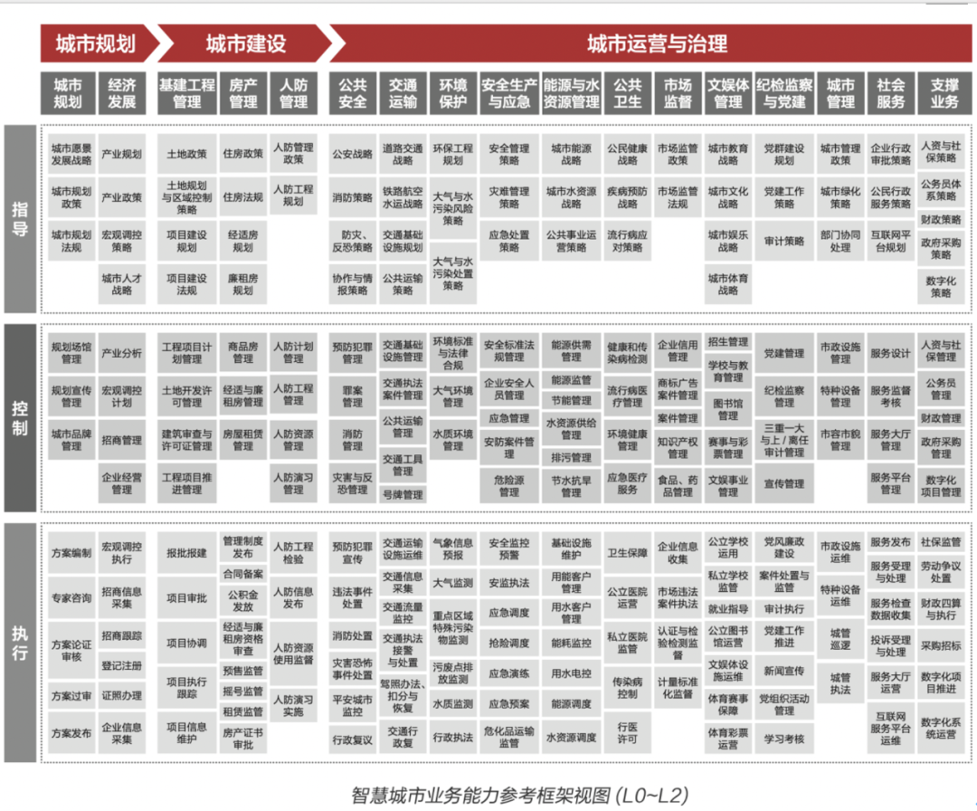 华为2019年发布的《智慧城市顶层规划咨询方法论》显示过智慧城市业务能力参考框架视图: