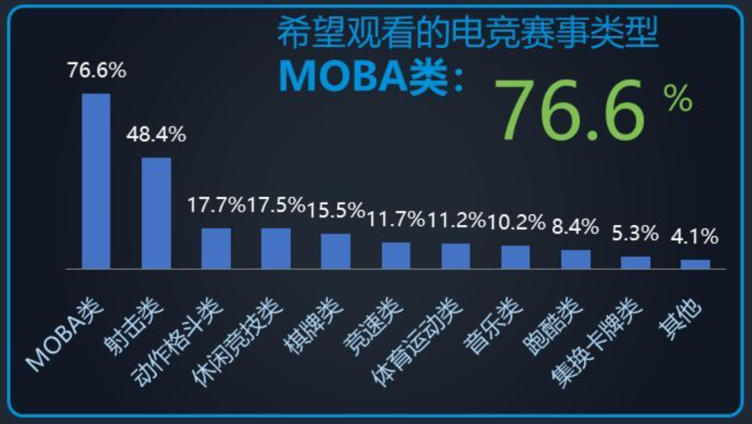 2018年,企鹅智酷发布的《2018年中国电竞运动行业发展报告》显示:以《英雄联盟》《王者荣耀》为代表的Moba游戏的关注度为76%。