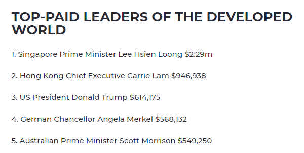综合多家澳洲媒体10月24日消息,澳大利亚总理莫里森(Scott Morrison)跻身全球薪水最高的领导人之列,位居全球第五,其年薪高达55万澳元(约合人民币262万元)。排在第一位的是新加坡总理李显龙(Lee Hsien Loong),包括奖金在内,他的收入为229万澳元。