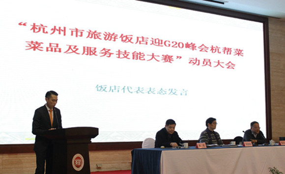 据了解,此次大赛以“展风采、树形象、优服务、提品质、促发展”为宗旨,分杭帮菜烹饪大赛、宴席设计与服务规范技能、西式(早餐)设计与制作三大比赛项目,参赛单位为杭州市推荐承担G20、B20峰会及媒体接待任务的50家宾馆饭店。