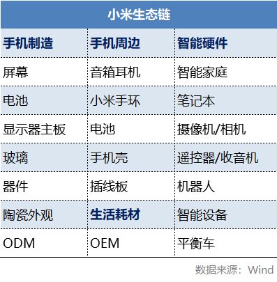 按照Wind最新的数据统计,在智能手机制造端同小米有合作的公司共有包括长信科技、德赛电池、京东方在内的29家上市公司。这些企业虽然也包括在小米的产业链条中,但小米生态链的价值提升更多来自于包括手机周边、智能硬件和生活耗材这些品类的增长。