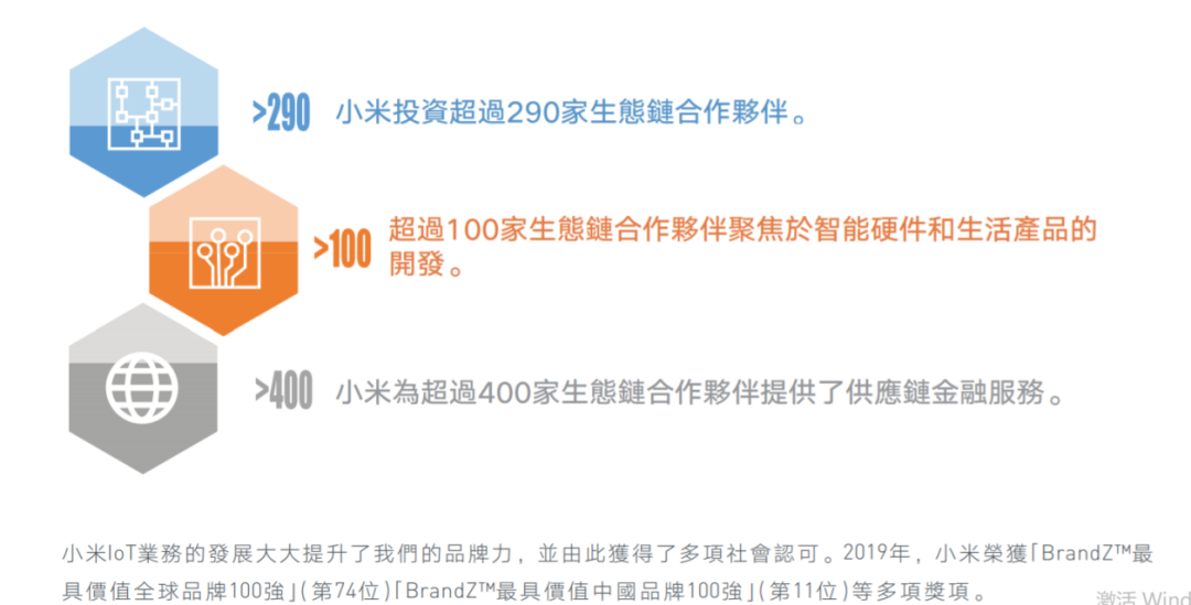 截至2020年10月Wind的数据显示,小米生态链涉及的企业已经超过400家,在全球消费级物联网市场上排名第一位。另外,小米生态链产品也支撑起了“小米”品牌价值的提升。据2019年BrandZtm的品牌价值排行榜显示,“小米”排名全球最具价值品牌第74位,中国区第十一位。