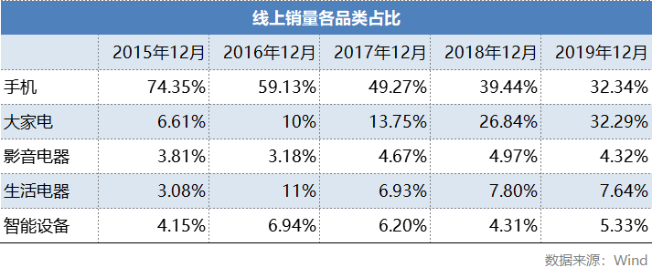 同时,从Wind统计的小米集团线上销量分布可以看到,尽管手机业务仍是集团收入贡献最大的品类,但他的销售占比已由5年前的74.35%降至32.34%。