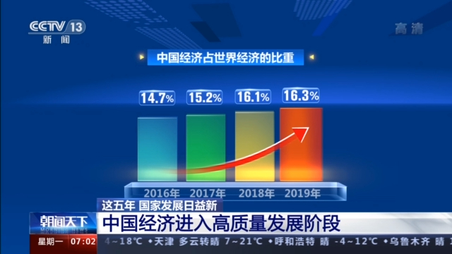 十三五时期,从2016年到2019年的中国经济总量曲线图显示,四年来,中国经济总量一年上一个大台阶,年均经济增长率达到6.7%,高于世界经济平均水平3.9个百分点。
